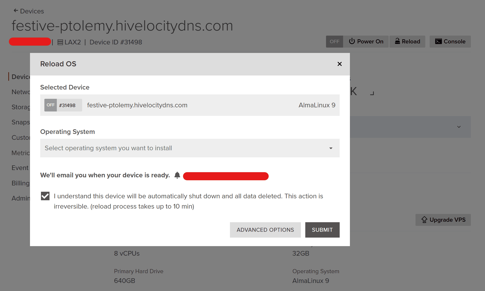 - When you’re ready, press the Submit button and your VPS will proceed with the reload process. *Note: this process can take some time so monitor the progress in your devices list within the customer portal and your email inbox as a confirmation email will be sent out upon completion.