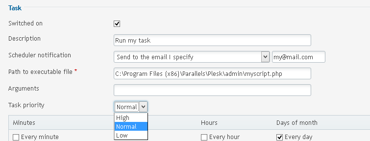 - Now, scroll down a bit and in the section beneath Task priority, you’ll see a calendar. Here, you can select the frequency with which your command runs. For this example, we’ve selected Every day, Every month, and under Days of the week we’ve also selected Every day